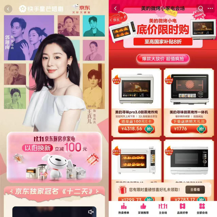 相比较淘宝天猫的花大力气在长视频领域上奋斗,京东则更爱“短”平快的效果,无论是如上文所言“少爷与我”、“外星丛”都替其拍摄各个TVC,在社交媒体上传播,意图形成病毒式效应,还是联动快手,一连推出多部定制短剧,都能看出京东对于高效转化的强需求。