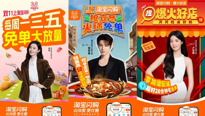 淘宝天猫这边,首当其冲的还是淘宝闪购,其双11福利大使囊括宋轶、卢昱晓、侯明昊等,除此之外,天猫新品国补推荐官刘涛、天猫双11福利大使陈靖可、天猫双11·学生福利课代表何运晨等人也难以撑起星光。